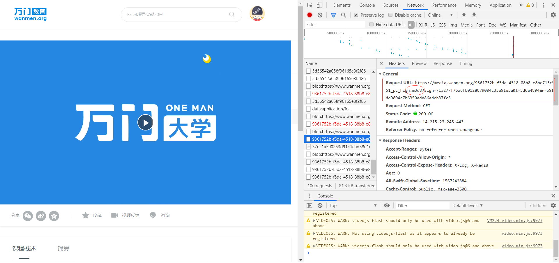 刷新页面,找一个 "https://media.wanmen.org/9361752b-f5da-4518-88b8-e8be713c5351_pc_high.m3u8?sign=71a277f76a6fb0128079004c33a91e3a&t=5d6a4894&r=b9ffcdd9804c7b6350ede86adcb37fc5" 带有m3u8的连接