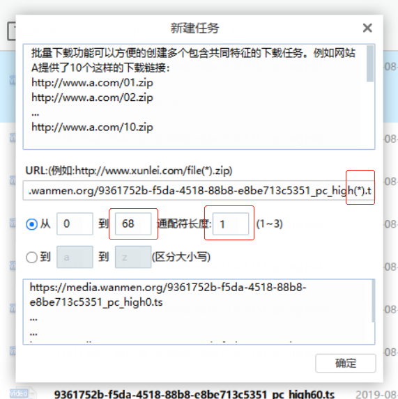 重点看下面红框部分:Url规则用 (*) 替换;个数为m3u8文件看到的 68 ;匹配长度填 1 。